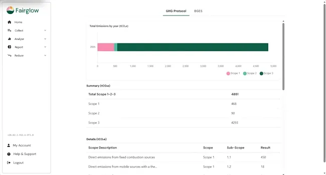 La plateforme Fairglow centralise et enrichit vos données pour produire une comptabilité carbone alignée avec le standard de votre choix (Protocole GHG, BEGES, etc.), incluant les émissions directes et indirectes, avec un niveau de granularité adapté aux réalités industrielles.